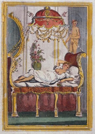 As if this was not enough, the bed was loaded with other diversions and adornments: Atop the dome where Cupid and Psyche, Hymen watching over them with an electric crown in one hand and torch in the other. Inside were caged turtle doves, automata (a creepy pastoral show with nymphs, brides and bridegrooms entering the temple of hymen). And all topped off with an electric message, reading “Be fruitful, multiply and replenish the earth”